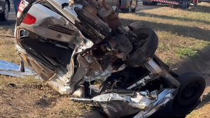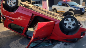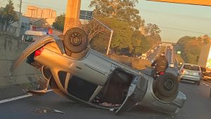 Um acidente impressionante foi registrado na manhã desta segunda-feira (11) na Avenida Campos Salles, em Americana. Um Fiat Mobi capotou